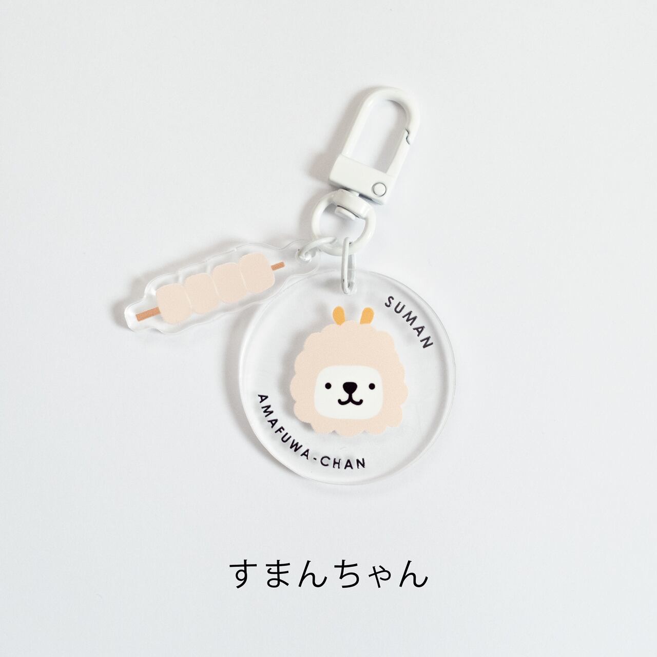 あまふわちゃんは焼いた後の焼きまんじゅう、すまんちゃんは焼く前の焼きまんじゅうと一緒になっているキーホルダーです。
